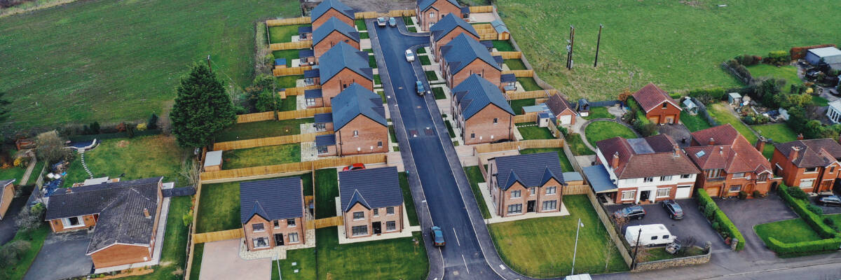 Fortfield Manor is a collection of 15 modern family homes in the Seafront village of Greenisland, County Antrim. On this project we provided homes in an area of high demand, to a high quality. The scheme is a mixture of detached and semi-detached homes, a selection of which benefit from a spectacular Lough View. Built in a traditional block and brick methodology, the homes have a distinct red appearance, with contrasting black doors, window frames and roof tiles, giving a sharp Architectural appearance.